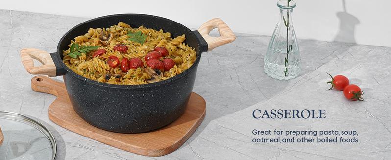 - Durable Bakelite Handle: With heat-resistant properties allow you do not worry about burning fingers in picking up the pot. Perspective glass lid ergonomic design allow you to check the status of the food in the pot in time.