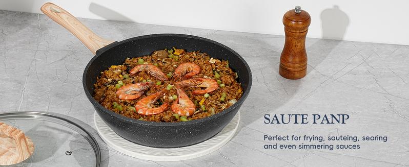 - Versatile Cooking Set: SODAY 12 pcs kitchen cookware set includes 9 inch/11 inch frying pans, 11 inch/4.5QT Saute Pan,4.3 QT saucepan with lip, 1.5 QT saucepan with lip and 4 protector ideal for your daily cooking.